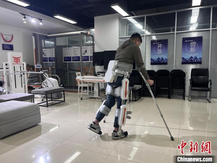 志愿者林寒正熟练地操控外骨骼机器人。王利文摄